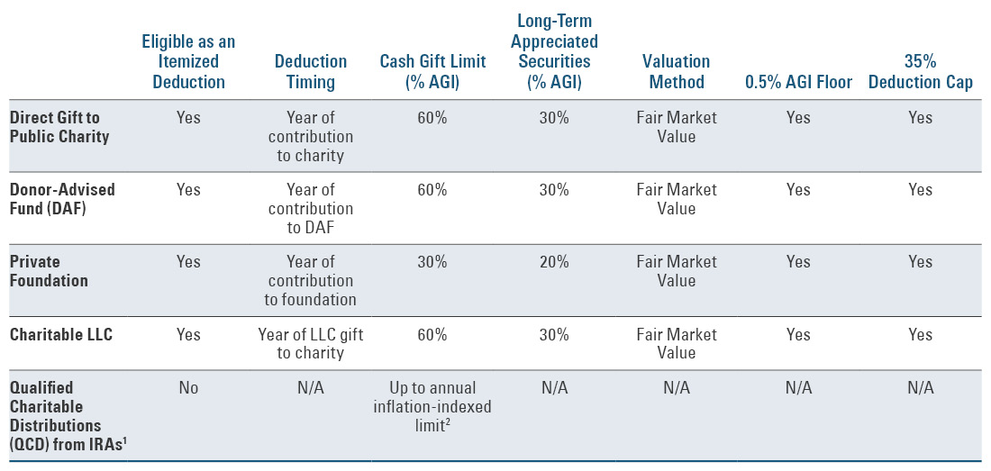 For a detailed summary, refer to the table titled “Tax Considerations for Charitable Giving.”