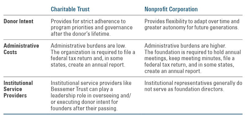 Private foundations can be structured as a charitable trust or a nonprofit corporation. Donors should consider the following elements when determining which structure will work best for their philanthropic goals: