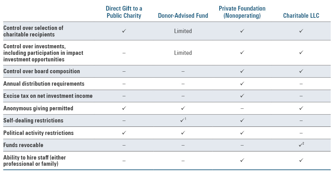 The exhibit shows that donors retain full control over recipient selection when making direct gifts, while DAFs provide limited advisory influence. Private foundations and charitable LLCs offer the highest level of control across recipient selection, investment decisions (including impact investing), and board composition.