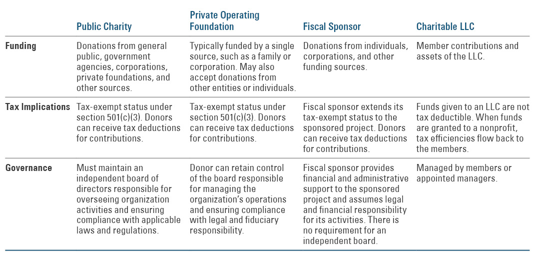 Compare key characteristics of vehicles commonly used to launch or operate philanthropic initiatives.