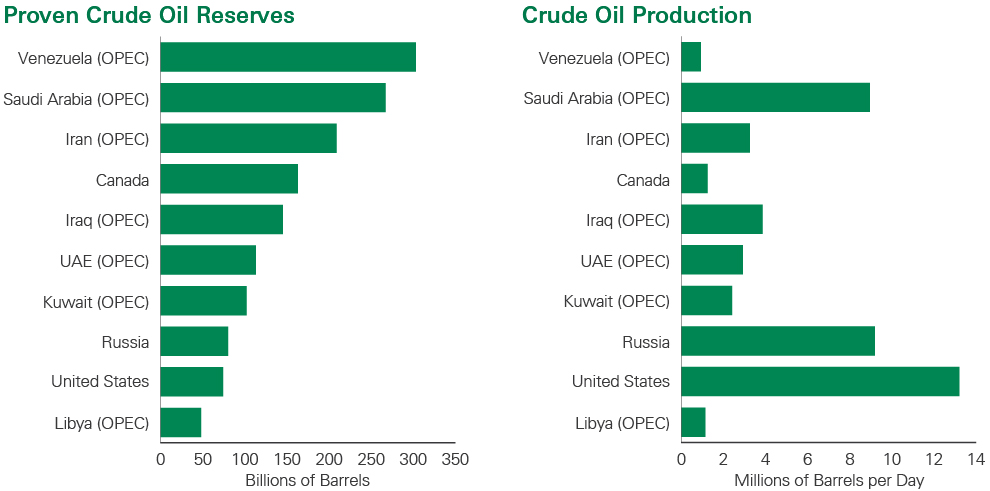 On the right panel, titled “Crude Oil Production”, countries are ranked by daily output measured in millions of barrels per day. The United States leads global production at approximately 13 million barrels per day, highlighting its operational efficiency and shale-driven production model. Saudi Arabia (OPEC) and Russia follow closely at around 10 million barrels per day each, underscoring their pivotal roles in balancing global oil markets. Iraq (OPEC), Iran (OPEC), UAE (OPEC), and Kuwait (OPEC) demonstrate strong mid-tier production capacity, while Canada and Libya (OPEC) contribute more modest output relative to their reserve positions. Venezuela (OPEC) shows notably low production despite having the largest reserves, signaling geopolitical, infrastructural, and investment constraints.