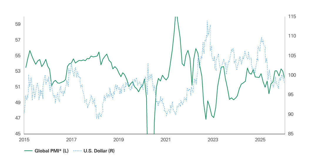 Dual-axis line chart comparing Global Purchasing Managers’ Index (PMI) on the left axis and the U.S. dollar index on the right axis from 2015 to 2025. Global PMI reflects economic cycles, including a sharp downturn in 2020 and recovery in 2021. The U.S. dollar generally strengthens during periods of weaker PMI, highlighting the inverse relationship between global growth momentum and dollar performance.