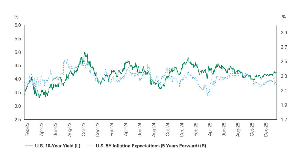 Dual-axis line chart from early 2023 through late 2025 showing the U.S. 10-year Treasury yield on the left axis and 5-year forward inflation expectations on the right axis. Both measures rise through 2023 and stabilize thereafter, illustrating evolving real rate conditions and market-based inflation expectations that shape the investment backdrop for real assets.