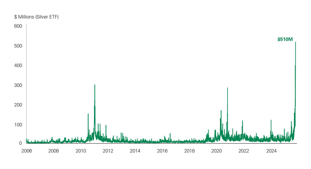 Time-series chart displaying silver ETF fund flows in millions of dollars from 2006 through 2025. While most periods show modest flows, there are pronounced spikes during periods of market stress or reflationary momentum, including major surges around 2011, 2020, and a record inflow of approximately $510 million in 2025, signaling renewed investor demand for silver exposure.