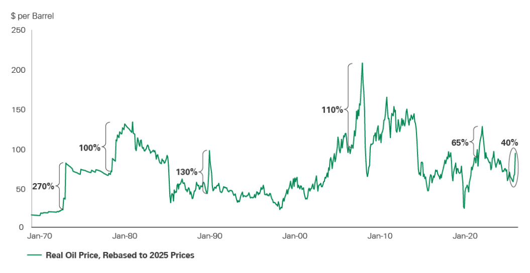 Key takeaway: Oil prices, adjusted for inflation, have risen by roughly 40%, well below the 100%-or-more increases that have historically preceded economic downturns.