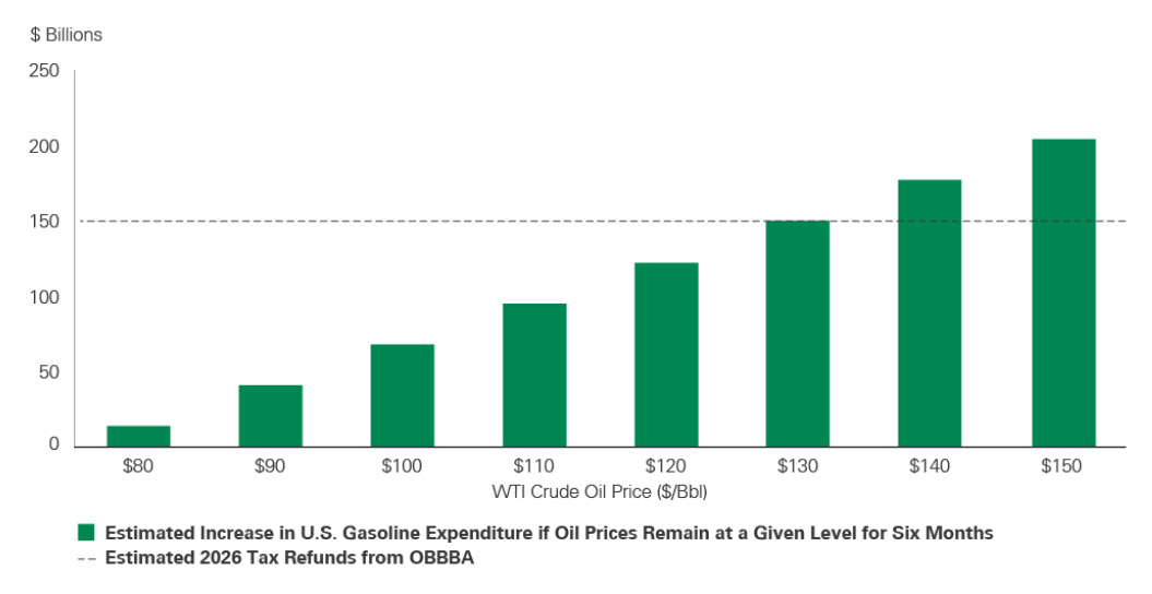 Key takeaway: Consumer tax refunds from the OBBBA provide a meaningful offset to higher gasoline costs, with the Congressional Budget Office (CBO) estimating a fiscal stimulus contribution of approximately 0.9% of GDP this year.