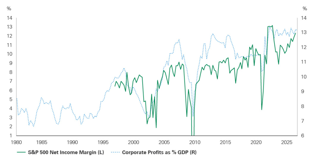 Key takeaway: Corporate sector balance sheets remain healthy, supported by record-high profit margins, strong free cash flow, and low leverage.