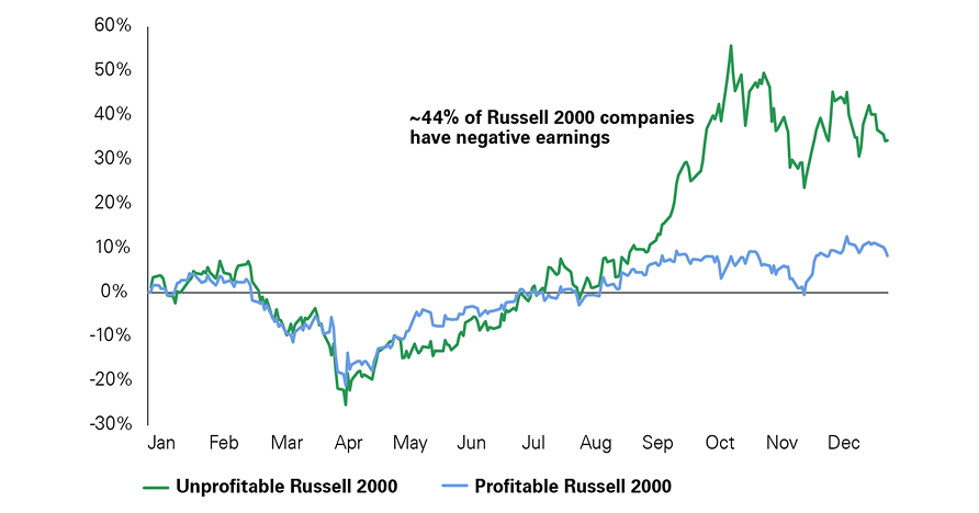 Profitable companies show a more modest and stable recovery, ending the year near +10%. A text annotation on the chart states that approximately 44% of Russell 2000 companies have negative earnings, reinforcing the breadth of unprofitable firms driving the higher-beta rally. Overall, the chart highlights significant risk-on behavior and speculative leadership concentrated in unprofitable small-cap stocks.