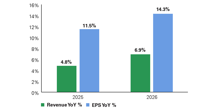 For each year, two bars are shown. Green bars represent EPS year-over-year growth, while light blue bars represent revenue year-over-year growth. In 2025, EPS growth is shown at 4.8%, while revenue growth is higher at 11.5%. In 2026, both metrics accelerate, with EPS growth increasing to 6.9% and revenue growth rising to 14.3%.