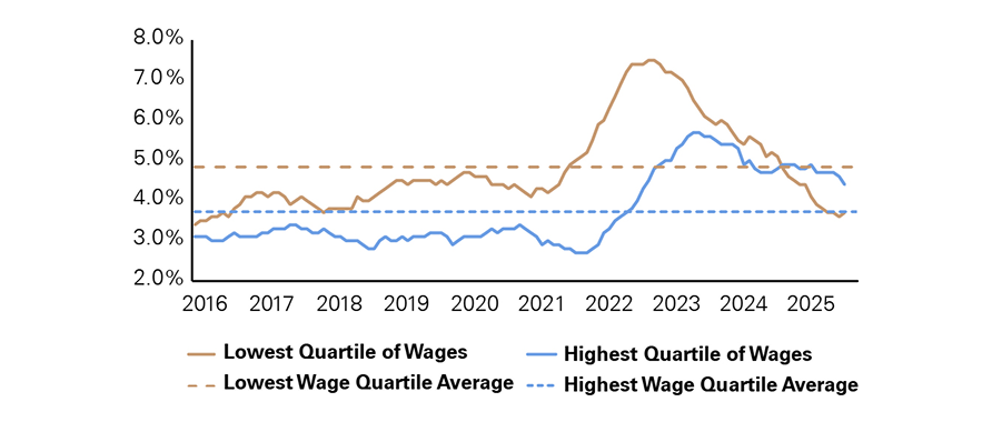 From 2023 onward, both lines trend downward. By 2025, wage growth for the lowest quartile falls slightly below its long-term average, while the highest quartile converges near its historical average. The chart highlights compression in wage growth momentum and a normalization following an unusually tight labor market.