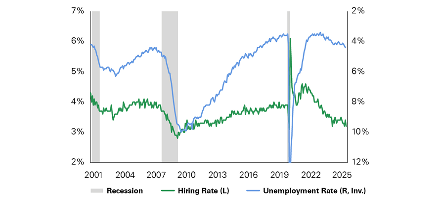 This dual-axis line chart shows U.S. hiring rates and unemployment rates from 2001 through 2025, with shaded gray vertical bands marking recession periods.